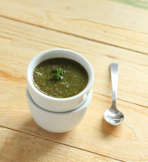 In a blender, Add 1 medium juicy tomato- chopped, 2 cups mint leaves, 1/2 cup thyme, 2-3 cloves of garlic, 1/4 green chili or red chili flakes, salt to taste, 1 teaspoon lemon juice.