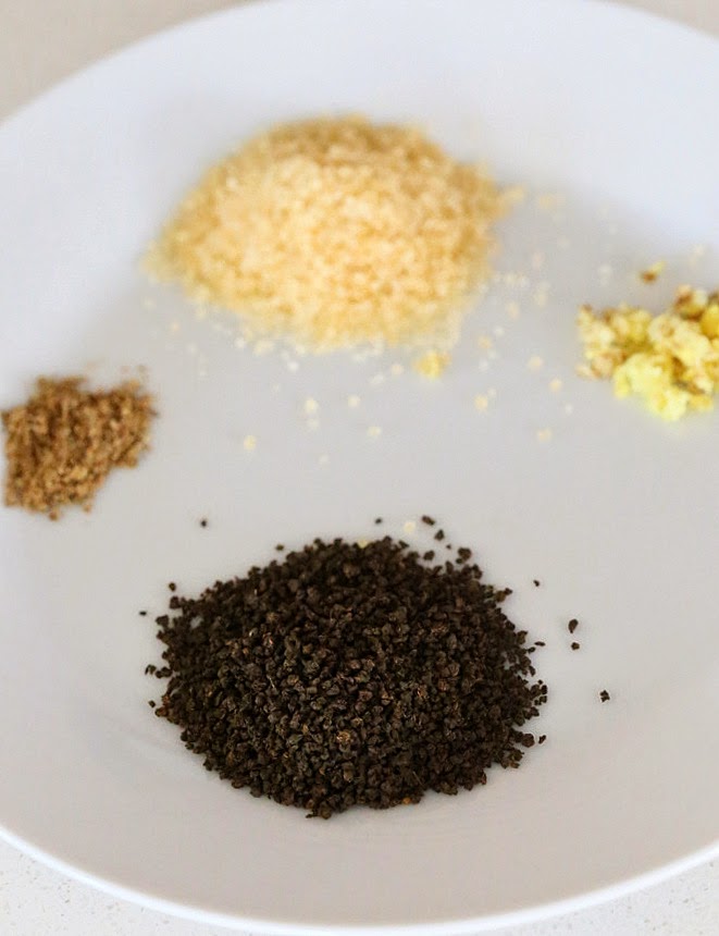 Get all the ingredients for the chai ready. Clockwise from the top. Raw sugar, grated fresh ginger, Chai patti(dry loose tea), chai masala blend.